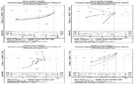 En el caso de la erupción del Volcán Cumbre Vieja gracias a la correspondencia que existe entre las imágenes satelitales y la salida del modelo de trayectoria para 10 días, se puede observar que en la semana correspondiente al 29 de septiembre de 2021 hasta el 8 de octubre de 2021 debe ocurrir la llegada a Cuba, y a territorio habanero, de la pluma de cenizas. Esta conclusión debida a que el Hysplit es un modelo langrangiano que calcula los movimientos de las masas de aire en el tiempo.