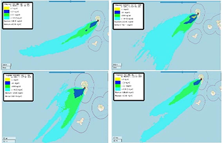 Las mayores concentraciones se estimaron al sureste de la isla con valores de 1 mg/m3 y se dirigen hacia el oeste con respecto a la fuente de emisión.
