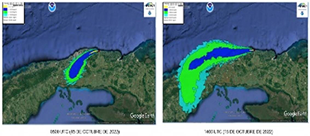 Se obtuvo la posible dispersión que presentaban los contaminantes expulsados por la CTE Ernesto Che Guevara para el día 15 de octubre 2022, para dos horarios de máxima emisión 0500 UTC y 1400 UTC. (Figura 7)