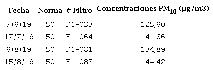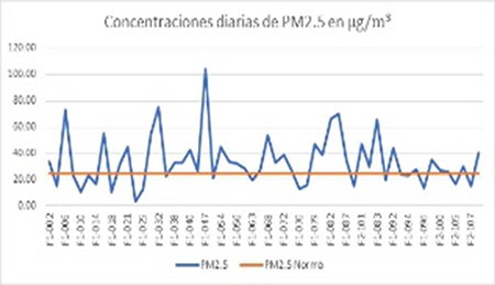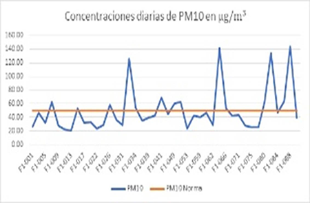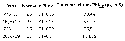 Los días que excedieron las normas cubanas establecidas de PM2.5 (50 µg/m3) y PM10 (25 µg/m3), así como los valores de las concentraciones correspondientes se arrojan en las siguientes tablas: