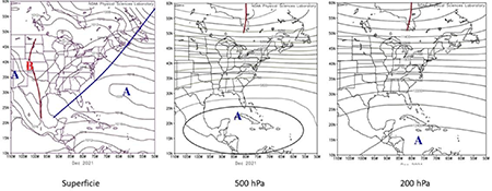 El mes de diciembre, con solo un frente frío afectó al territorio nacional, presentando un patrón circulatorio muy similar al determinado por Jústiz (2017), como se muestra en la figura 1. El mismo se caracterizó por un sistema frontal extendido desde el Atlántico noroccidental hasta el golfo de México en superficie, mientras lo más significativo resultó la marcada presencia de una profunda dorsal del anticiclón Subtropical, con centro al sur de Cuba en los niveles medios de la troposfera, la cual se encontraba desplazada ligeramente al sur en la troposfera alta, limitando considerablemente el paso de las vaguadas de oeste por bajas latitudes y por consiguiente la intrusión del aire frío en los trópicos.