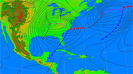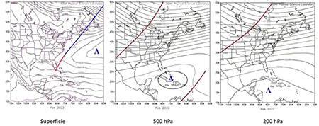 En esta temporada 2021-2022, el mes de febrero también mostró una tendencia poco activa, con dos frentes fríos. Este mes se caracterizó por la presencia en superficie de una zona frontal extendida de nordeste a suroeste a lo largo del Atlántico occidental, desde los mares muy al nordeste de Terranova hasta la costa oriental de la península de la Florida. (figura 2). El patrón sinóptico predominante, de igual manera tuvo un comportamiento muy similar al determinado por Jústiz (2017), aunque la vaguada en la troposfera media y alta evidenció una mejor representación y estructura. La misma se extendió por el centro de Norteamérica hasta las cercanías de los 30 ºN y al sur de dicha latitud predomina la dorsal anticiclónica en gran parte del dominio de estudio. Este flujo zonal positivo limitaba la expansión en bajas latitudes de la onda polar, que está inmersa en una vaguada de amplitud abierta.