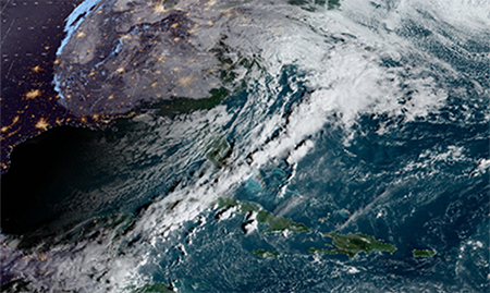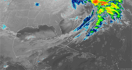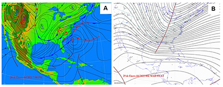 En la madrugada del día 29 de enero de 2022 llegó al occidente de Cuba el noveno frente frío de la temporada invernal 2021 - 2022. El mismo se extendía desde un centro de bajas presiones extratropical localizado en los mares al este de cabo Haterras, sobre el sur de la península de la Florida y el sudeste del golfo de México (figura 8a). Las altas presiones migratorias que le sucedían al frente, desbordaron su influencia por delante del mismo, induciendo una vaguada sobre el territorio cubano que incentivó los nublados y las lluvias en la tarde del día 28 en la región occidental. La vaguada polar asociada al sistema era de tipo abierta y se extendía sobre la porción oriental de Norteamérica, adentrándose sobre el norte del mencionado golfo en toda la columna troposférica, como se puede observar en la figura 8b. La banda frontal estaba caracterizada por nubes en capas y aislada actividad convectiva hasta las Bahamas, más debilitada en su porción sur, donde tenía predominio de nublados bajos (figura 9).