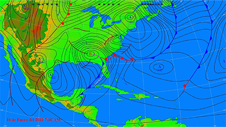 El séptimo frente frío de la temporada invernal llegó a Cuba el 16 de enero de 2022. El sistema venía acompañado de una vaguada prefrontal, la que a las 1200 UTC del mencionado día se extendía desde la península de la Florida hasta el noroeste de provincia de Pinar del Río (figura 6). La misma comenzó a afectar esa provincia y el norte de la provincia de Artemisa desde el final de la mañana del día 16, generando a su paso numerosas lluvias y tormentas eléctricas. Los acumulados más significativos se reportaron en la provincia de Pinar del Río, con 33 mm en la estación meteorológica de Paso Real de San Diego, provincia Pinar del Río, mientras en los pluviómetros del INRH los mayores acumulados fueron 48.5 mm en la Torre Forestal Guanito (municipio Pinar del Río), seguido de 48.3 mm en la Estación de Aforos V Aniversario (municipio Minas de Matahambre). Por otra parte, la actividad prefontal de chubascos y tormentas eléctricas estuvo acompañada de vientos fuertes en rachas. En la estación meteorológica de Casa Blanca, La Habana, se registraron vientos sostenidos de 40 km/h y una racha máxima de 80 km/h del noroeste, mientras en la provincia de Mayabeque se registró en la estación meteorológica de Batabanó, 68 km/h del oeste.