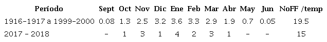 La temporada invernal estuvo por debajo a lo normal con relación al valor climático (19 frente frío por temporada) con un total de 15 frente fríos. Específicamente, los meses de noviembre, enero y marzo estuvieron cercano a lo normal, según el promedio de afectación de frentes para estos meses, comportándose noviembre ligeramente por encima de la media climática, mientras el resto de los meses de la temporada tuvieron un comportamiento anómalo negativo.