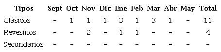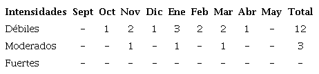 Se clasificaron por su tipo 12 frente fríos en clásicos (80.0 %) y 3 revesinos (20%), mientras que por su intensidad 11 frentes fríos fueron débiles (73.3 %) y 4 moderados (26.7 %).