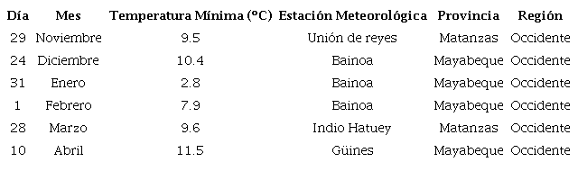 La temperatura mínima más baja reportada en la temporada invernal fue de 2.8 ºC y se registró en la madrugada del día 31 de enero de 2022, en la estación meteorológica de Bainoa, provincia Mayabeque, perteneciente a la región occidental de Cuba. Esa madrugada fue notablemente fría en gran parte del país después del paso del frente frío número 9, al reportarse valores de temperaturas mínimas en 34 estaciones meteorológicas con inferiores a 10 ºC, de las cuales 13 tenían valores menores a 7 ºC.