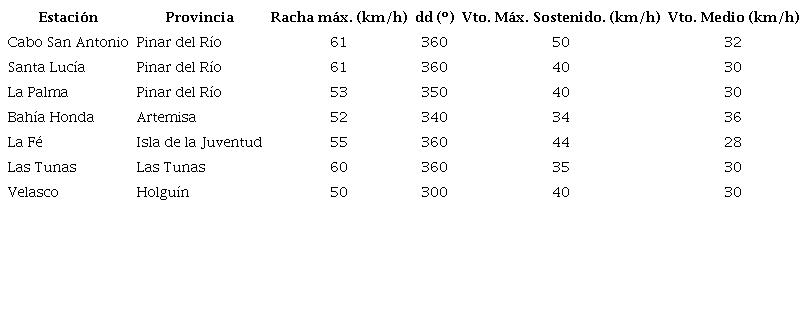 La interacción del flujo generado por la circulación de la baja extratropical y el anticiclón oceánico que tenía su región central al sur de Las Bermudas, generó vientos sostenidos del suroeste por delante del frente en el occidente del país, registrándose en la estación meteorológica de Casa Blanca, la Habana, vientos máximos sostenido de hasta 40 km/h, con una racha máxima de 65 km/h del suroeste a las 15:12 UTC.