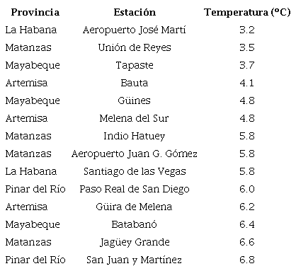 Tras el paso del frente frío, con la imposición de las altas presiones migratorias se registraron vientos fuertes del cuarto cuadrante sobre el occidente del territorio nacional que generaron fuertes marejadas en el litoral norte del occidente del país, con ligeras inundaciones en zonas bajas de este litoral durante el sábado 29, incluyendo el malecón de la Habana. Por otro lado, con la imposición de la masa de aire frío y seco, se produjo un descenso de las temperaturas durante varios días. El propio día 29 las temperaturas máximas en el occidente cubano estuvieron entre 20 y 23 °C, hasta 27 ºC en la región central, mientras el día 30 resultó invernal en las regiones occidental y central, con temperaturas máximas entre 15 y 18 ºC, con la temperatura máxima más baja registrada en Santiago de las Vegas (La Habana) con 15.8 ºC. En la región oriental las temperaturas máximas estuvieron entre 22 y 25 ºC. En cuanto a las temperaturas mínimas, la madrugada del día 30 resultó notablemente frío en localidades del interior de las regiones occidental y central, sobre todo en las provincias de Mayabeque, Matanzas, Cienfuegos, Villa Clara y Ciego de Ávila, con temperaturas mínimas entre 7 y 11 ºC, específicamente en 11 estaciones se reportaron valores de temperatura igual o inferior a los 10 ºC. La temperatura mínima más baja durante esta madrugada fue registrada en la estación meteorológica de Santo Domingo (Villa Clara) con 6.6 ºC. Sin embargo, la madrugada del día 31 fue incluso más fría en el occidente e interior de la región central, con un total de 34 estaciones meteorológicas con temperaturas mínimas inferiores a 10 ºC, de las cuales 13 tenían valores menores a 7 ºC. El valor más bajo se registró en Bainoa (Mayabeque) con 2.8 ºC, lo que constituyó récord para el mes de enero, mientras en la estación meteorológica de Nueva Gerona (Isla de la Juventud) se igualó el récord mensual. En el resto del territorio cubano las temperaturas mínimas estuvieron entre 14 y 17 ºC, superiores en zonas costeras. En la tabla 8 se muestran otros valores significativos de temperatura mínima en la madrugada del día 31.