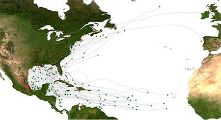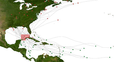 En cuanto a la zona de destino, en la figura 7 B se puede apreciar que el 45 % de los casos se desplazaron hacia los Estados Unidos con un total de 58 organismos, describiendo la inmensa mayoría una trayectoria meridional. Por el contrario, los desplazamientos latitudinales suelen ser poco frecuentes. Adicionalmente, el 35 % de los sistemas transitaron hacia las costas de México y el 10 % lo hace rumbo al estrecho de La Florida. En el golfo de México terminaron su trayectoria el 9 % de los organismos mientras que en el mar Caribe apenas lo hizo el 2 %.