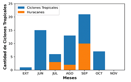 La máxima frecuencia de formación de ciclones tropicales sobre el golfo de México ocurrió en el mes de septiembre mientras que el mes menos activo es noviembre. En el bimestre agosto-septiembre se concentra la mayor cantidad de ciclones tropicales con un 58.3 %. Asimismo, los huracanes tienen su pico máximo de formación en el mes de septiembre, seguido por julio, mientras que la actividad mínima se produce en el mes de noviembre. De interés resulta la elevada tasa de gestación de huracanes sobre el golfo de México durante septiembre. Y es que esta situación se encuentra estrechamente relacionada con las características de la circulación atmosférica regional, en particular con el descenso en latitud de las zonas frontales que tiene lugar a finales del periodo estacional lluvioso.