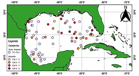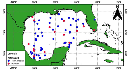 En la figura 3 se muestra la distribución de la ciclogénesis tropical sobre el golfo de México. En ella se puede apreciar que las tormentas tropicales se originan indistintamente en la totalidad del golfo de México. Similares comportamientos mostraron las tormentas tropicales que alcanzaron, en algún momento de su vida, la categoría de huracán.