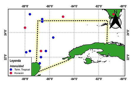 En el análisis del comportamiento de la actividad ciclónica tropical en el golfo de México se consideró el periodo 2000-2022, el cual comprendió 23 temporadas ciclónicas. Para ello se utilizó el reanálisis de Huracanes del Atlántico Norte HURDAT2 (Landsea et. al., 2015). Una vez extraídos los ciclones tropicales dentro del periodo de interés, se desestimaron aquellos casos que se quedaron como depresiones tropicales además de aquellos organismos subtropicales. Los organismos restantes se estratificaron según la zona de formación e intensificación, haciendo énfasis en aquellos que lo hicieron en la zona en la que suele localizarse con una mayor frecuencia la Corriente de Lazo.