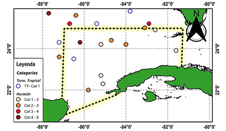 Más del 70 % de los ciclones tropicales que transitan sobre el área de estudio proceden del Mar Caribe. El 18 % de los ciclones tropicales realizaron un trayecto en sentido latitudinal a través del estrecho de la Florida mientras que apenas el 8 % de los sistemas contenidos en el área de estudio inició su trayectoria en el sudeste del golfo de México (Figura 12 A).