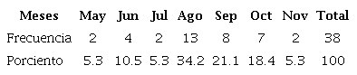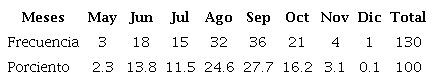 En la tabla 1 se presenta la distribución mensual de los ciclones tropicales que transitaron sobre el área geográfica del golfo de México. Los meses de mayor actividad ciclónica son septiembre, agosto y octubre, recogiéndose entre los ellos el 68.5 % de la muestra. Aclarar que, de los 130 organismos ciclónicos analizados, 6 de ellos permanecieron sobre el golfo de México como depresiones tropicales, los cuales no tuvieron un desarrollo ulterior sobre esta zona geográfica.