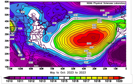 En los meses del periodo poco lluvioso el anticiclón subtropical del Atlántico Norte estuvo más desplazado al este-nordeste con respecto a su posición climatológica. Este sistema, presentó valores de presión central por encima de los usuales, excepto en el mes de marzo, donde fueron inferiores a 1020 hPa. Sobre el sudeste de los Estados Unidos se localizaron las altas presiones continentales migratorias e influyeron sobre la porción nororiental del golfo de México, las Bahamas y la región occidental de Cuba. Por otro lado, la vaguada frontal, estuvo separando los dos centros de alto barómetro, prolongándose al este de la costa oriental de Estados Unidos y Canadá. Esta vaguada, en el transcurso del mes de enero se mostró más profunda que lo habitual, no siendo así el resto de los meses que conforman el periodo poco lluvioso. Sobre Cuba y mares adyacentes la presión atmosférica presentó valores cercanos a lo normal, sin embargo, en los meses de abril y noviembre, estuvieron por debajo de su norma, anomalía que resultó más marcada hacia localidades de la región oriental del país.