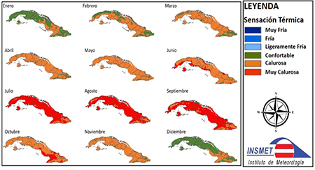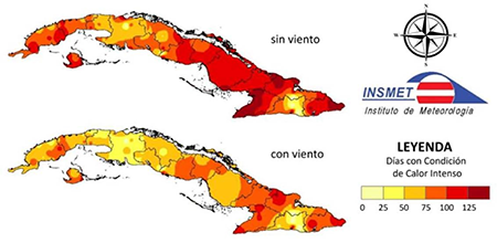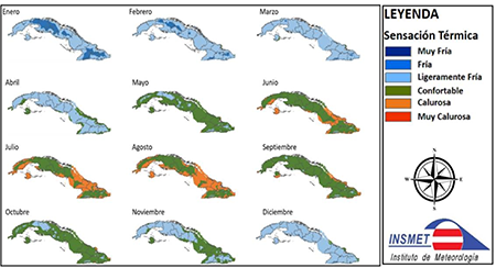 Por su parte la cantidad de días con condiciones de frío intenso (CFI), no tuvo un comportamiento significativo durante el año, aun ante la acción refrescante del viento. Solo se produjeron entre 5-10 días como promedio con esta condición (sin la acción del viento) en algunas localidades aisladas del país, las que se incrementaron con la acción del viento. En zonas montañosas como Topes de Collante en Santi Spíritus y la Gran Piedra en Santiago de Cuba, se reportaron 30 y 89 días, respectivamente, con Condición de Frío Intenso. Esto pudo estar asociado a la combinación de bajas temperaturas, humedad relativamente alta y vientos fuertes. En las zonas no muy elevadas solo llegaron a manifestase hasta 15 días en el año.