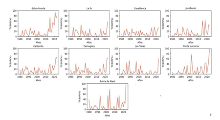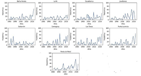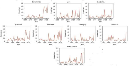 Similarmente, el por ciento de días cálidos (TX90p) reportó cifras récords en gran parte del país durante el año, destacándose los meses de julio y noviembre con más del 50 % de días con esta condición. En julio el valor reportado fue el más alto de la serie en las estaciones de Bahía Honda (90 %), La Fe (70 %), Casablanca (61 %), Caibarién (93 %), Las Tunas (63 %) y en Punta Lucrecia (74 %). Mientras en Jovellanos fue tercero con 64 % (Figura 12). Sobresalen con el mayor registro de la serie en noviembre 2023 las estaciones de La Fe con 56 %, Camagüey con 63 %, Las Tunas con 57 %, Punta Lucrecia con 65 % y Punta de Maisí con el 100 % de días con esta condición. En Bahía Honda y Caibarién constituyó el segundo valor más elevado del periodo de análisis con el 80 y 60 %, respectivamente (Figura 13).