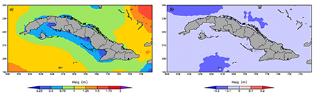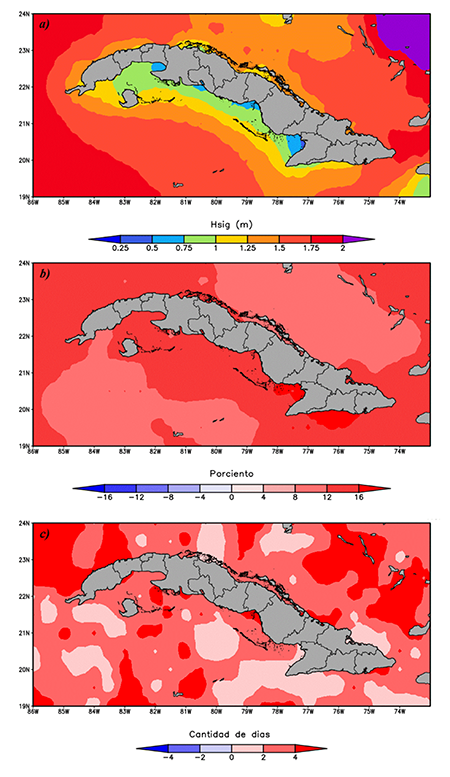 Con la intensificación del evento El Niño - Oscilación del Sur (ENOS), en el segundo semestre del año, se produjeron incrementos de los valores de Hsig por encima de la norma en todo el país. Así mismo, en el último trimestre producto del incremento de la actividad frontal asociado a la presencia del evento ENOS las anomalías positivas se localizaron en la costa noroccidental de Cuba.