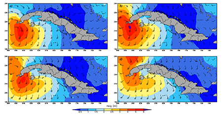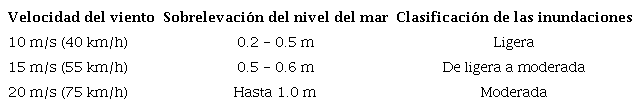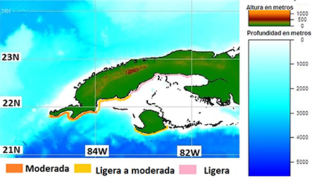 Puesto que Idalia en su trayectoria no tocó tierra cubana, toda la inundación ocurrió por predominio de arrastre del viento, fenómeno reconocido por su nombre en inglés wind setup (Figura 15). En ausencia de mediciones in situ, se utilizaron los métodos de cálculo realizados por Mitrani et al., (2001), considerando el viento del sudeste al sur, con velocidades de 10 m/s, 15 m/s y 20 m/s y tomando en cuenta las diferencias de batimetría hacia la línea costera. De esta manera, se identificaron como inundaciones ligeras a las menores de 0.5 m y las moderadas hasta 1.0 m. Los resultados se muestran en la siguiente tabla (Tabla 2).