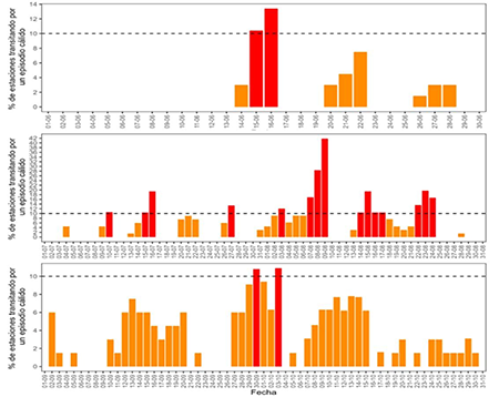 Lo más significativo ocurrió durante el mes de agosto en el que la temperatura media diaria alcanzó cifras superiores a los 28.0 ◦C en 27 días. Los días 7 y 8 fueron los más cálidos, con temperaturas medias diarias de 30.17 ◦C y 30.51 ◦C, respectivamente. Se registraron 23 nuevos récords de temperatura máxima. En correspondencia se presentaron 3 eventos extremos cálidos y un día cálido. El primer evento comenzó el dia 7 de agosto con una duración de tres días alcanzando su máxima intensidad el día 9 con una cobertura espacial significativa, pues estuvieron involucradas entre un 16 % y un 41 % de las estaciones del país. El segundo evento ocurrió del 14 al 17, siendo este el de mayor duración durante todo el 2023, alcanzando el día 15 un 19.4 % de estaciones transitando por un periodo cálido. El último fue del 22 al 24 de agosto aunque solo con una cobertura espacial del 13 al 16 % de estaciones. Estos extremos se produjeron fundamentalmente bajo la influencia de las altas presiones oceánicas, que generaron un flujo del segundo cuadrante en superficie y niveles bajos (Figura 18).