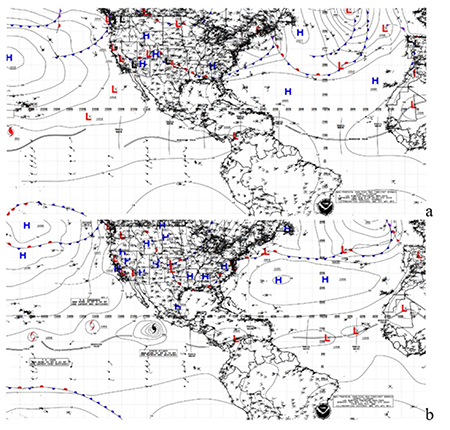 En el periodo lluvioso las mayores anomalías de la presión atmosférica a nivel medio del mar en el área geográfica estuvieron relacionadas con la influencia de las altas presiones subtropicales, principalmente sobre el océano Atlántico occidental. El anticiclón subtropical del Atlántico Norte, aunque estuvo localizado en aguas del océano Atlántico oriental, su posición varió ligeramente con respecto a su climatología. Cabe resaltar que producto de la presencia de una amplia zona de vaguadas con su eje extendido a lo largo de la costa oriental de Estados Unidos y Canadá, con una vaguada invertida prolongada en aguas del océano Atlántico occidental, la influencia anticiclónica subtropical estuvo más retraída que lo usual, quedando Cuba en la periferia de este sistema de alto barómetro, con valores de la presión atmosférica por debajo de los habituales (Figura 1). En la troposfera media y alta, la localización de dos zonas de vaguadas, una sobre el Atlántico oriental y otra sobre la costa este de Canadá y Estados Unidos, alteraron la estructura del cinturón de altas presiones subtropicales, lo que repercutió en un fortalecimiento anómalo del anticiclón mexicano para esta época del año, anticiclón que se mostró bien definido en 500 hPa, y más expandido en 200 hPa.