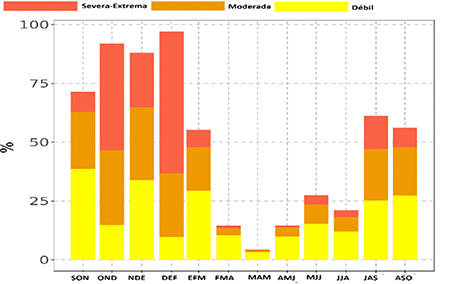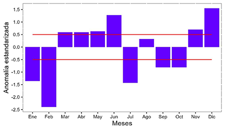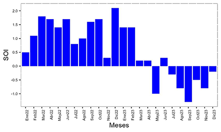 La circulación atmosférica se ajustó gradualmente a los patrones propios del evento ENOS. Desde el mes de julio, el Índice de la Oscilación del Sur (SOI) alcanzó valores negativos, con -0.30 unidades. El mayor valor de este índice se produjo en septiembre con -1.30 unidades. Los valores medios de tres meses se registraron en octubre y noviembre (-0.87 unidades), valores propios de este evento (Figura 3). El Índice ENOS (IE) superó su umbral para un evento ENOS en el mes de julio y su valor máximo se alcanzó en noviembre, con 205 unidades.