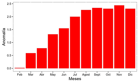 En el año 2023 se desarrolló un nuevo evento El Niño - Oscilación del Sur (ENOS). Al finalizar junio, las anomalías de la temperatura superficial del mar alcanzaron valores superiores al umbral de un evento El Niño. En la región Niño 3 se alcanzó una anomalía de 1.5 °C, con respecto a la norma 1961 - 1990 (Figura 2). Por ello, el Centro de Predicción Climática de los Estados Unidos, consideró como iniciado dicho evento. Durante los siguientes meses se incrementó el sobrecalentamiento de las aguas en las regiones central y oriental del océano Pacífico ecuatorial. La mayor anomalía se registró en noviembre del 2023, con un valor de 2.44 °C. El valor medio de los tres meses comprendidos entre octubre y diciembre ascendió a 2.35 °C. Teniendo en cuenta este indicador, el evento podía considerarse como un evento fuerte.