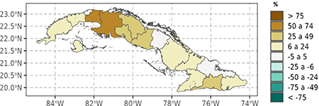 En el periodo lluvioso, por el contrario disminuyeron las áreas afectadas con sequía en todas sus categorías. En esta ocasión solo el 34 % del territorio nacional presentó sequía meteorológica, por los acumulados de lluvias ocurridos fundamentalmente en la región oriental del país durante los meses de mayo y junio. De ellos el 9 % en la categoría severa-extrema, el 10 % moderada y el 15 % débil. Las regiones occidental y central fueron las más afectadas y dentro de ellas las provincias Artemisa, La Habana, Mayabeque, Matanzas, Cienfuegos y Sancti Spíritus (Figura 25). El mayor por ciento de áreas con sequía moderada y extrema se produjo en los trimestres julio - septiembre y agosto - octubre 2023 (Figura 22).