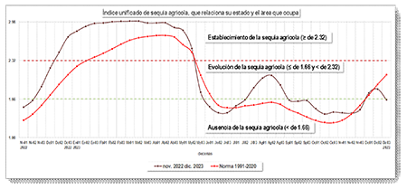 A partir de diciembre del 2022 y hasta inicios de mayo del 2023, la sequía que afectó el país se clasificó en la categoría de media o alta, por el incremento de las áreas con presencia de “sequía agrícola establecida”. De ahí que fuera necesario decretar la fase de Inicio sequía °2 (persisten áreas mayores al 66% de extensión superficial con severidad media o alta). Sin embargo a mediados del mismo mes de mayo, por la no presencia de áreas entre 33 % y 66 % de extensión superficial con severidad media o alta, se decretó la fase de Fin de sequía °2. En el resto del año por el predominio de la no presencia o poca extensión superficial (menos del 33 % del territorio) de afectación por sequía agrícola permitió decretar y mantener los avisos de “No sequía agrícola”.