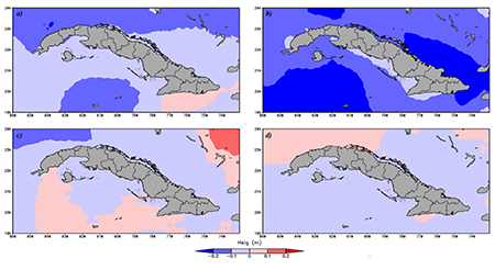 Oleaje e inundaciones costeras: Las anomalías del valor medio anual de la altura significativa de la ola en el 2023, estuvieron por debajo de sus valores normales en todos los mares circundantes a Cuba, fundamentalmente en el sudeste del golfo de México y en el mar Caribe central donde alcanzó su mayor intensidad.