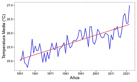 El año 2023 ha sido el más cálido en Cuba desde 1951. La temperatura media anual registrada en este año fue la más alta desde 1951 (Figura 6), al alcanzar una anomalía de 1.38 °C por encima de la media histórica del periodo 1961-1990 que es 25. 6 °C. De tal forma, ha desplazado a los años 2019 y 2020, ahora en segundo y tercer lugar, con diferencias de 0.26°C y 0.27°C, respectivamente. Fue un año sumamente caluroso, caracterizado por anomalías positivas (cálidas) superiores a los 0.9 °C en todos los meses del año, principalmente en enero, febrero, julio y agosto.