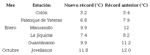 En varias estaciones meteorológicas del país los reportes de temperaturas mínimas fueron inferiores a los 10.0 °C y en ocasiones estuvieron iguales o inferiores a 5.0 °C . El valor más bajo se reportó en la estación meteorológica de Indio Hatuey, en la provincia de Matanzas, con 1.5 °C. También resultó de interés que en varias estaciones meteorológicas del oriente cubano se registraron temperaturas mínimas por debajo de los 10.0 °C. Tal es el caso de los reportes de 7.4 °C en la estación la Jíquima, en la provincia de Holguín, 9.9 °C en la estación de Manzanillo, provincia Granma, y 6.9 °C en la estación de Palenque de Yateras y 9.9 °C Guantánamo, ambas en la provincia Guantánamo que constituyen valores récords para un mes de enero en esas estaciones. El valor reportado en Palenque de Yateras constituye un récord absoluto de temperatura mínima para toda la provincia de Guantánamo en el mes de enero.