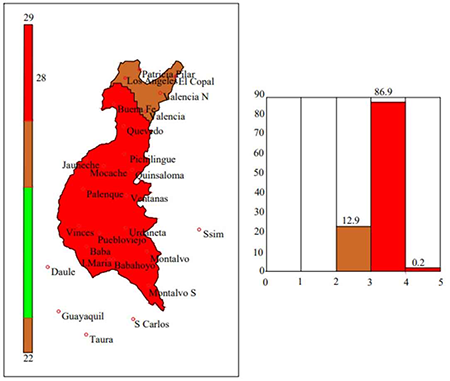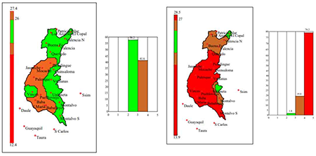 El escenario RCP 8.5, 2011-40 es similar al RCP 6.0, 2041-70, determinado por la mayor elevación de la temperatura del primero. Se favorecen los cantones al Sur que tenían temperaturas más bajas que los requerimientos de la Balsa, mientras que pasan de Favorables a Moderadas las condiciones de los sectores Jauneche, Mocache, Palenque, I.María y Babahoyo. En el escenario 2041-70, aunque las condiciones empeoran, todavía es exigua el área con condiciones Desfavorables. Los sectores con condiciones Desfavorables son Jauneche, Pichilingue, Baba, Babahoyo e I.María las condiciones Moderadas imperan para este escenario, alcanzando un 52,2% (Figura 5).