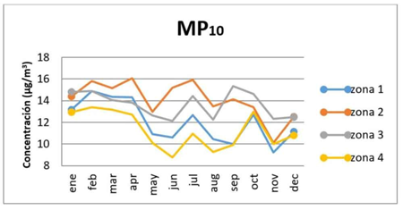 La zona 1 reportó los valores medios máximos en marzo y abril con 14 µg/m3 y la zona 4 no superó los 13 µg/m3 mensuales alcanzados en los meses de enero a abril, y en octubre. En estas zonas se encuentran también fuentes naturales y antropogénicas emisoras de PM, como es el caso de Habana del Este y el Cotorro respectivamente (Cuesta et al., 2020).