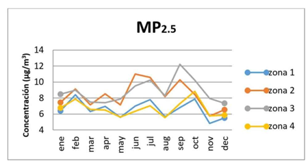 Las zonas 2 y 3 reportaron valores ligeramente superiores. La zona 2 alcanzó valores medios máximos de 16 µg/m3 en febrero, abril y julio y la zona 3 valores de 15 µg/m3 durante enero, febrero, septiembre y octubre. Estas zonas incluyen municipios como Regla, San Miguel, Habana Vieja y La Lisa, los cuales cuentan con importantes fuentes fijas emisoras de material particulado (Cuesta et al., 2019).