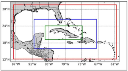 Otra herramienta utilizada en esta investigación fue las salidas numéricas proporcionadas a partir del Sistema de Pronóstico Inmediato (SisPI). Con estas salidas se obtuvieron las variables primarias, a partir de las cuales se determinaron otras secundarias que fueron utilizadas en la determinación de los valores de los factores físico-meteorológicos. Este sistema fue desarrollado por el Centro de Física de la Atmósfera del INSMET y tiene como objetivo esencial la predicción a corto plazo de los diferentes procesos atmosféricos. Según Sierra et al. (2017): “el SisPI tiene en su base el modelo atmosférico WRF en su versión 3.5. Este sistema es inicializado con los datos del Global Forecast System (GFS) de 0.5 grados de resolución espacial y tiene cuatro actualizaciones diarias (0000, 0600, 1200 y 1800 UTC) de su pronóstico con una actualización trihoraria de las condiciones de frontera laterales. Cuenta con tres dominios de simulación con resoluciones de 27, 9 y 3 km (figura 1), con un horizonte de pronóstico de 24 horas para el dominio de 3 km y de 72 horas para los dominios de 27 y 9 km”.