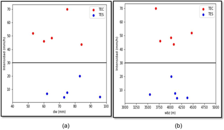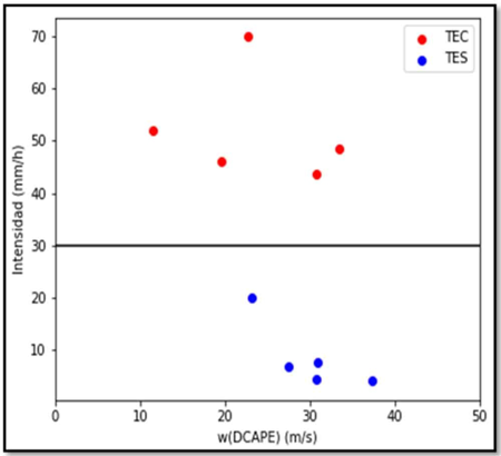 Se calcularon para cada caso de estudio de TEC y TES los factores físico-meteorológicos expuestos anteriormente y se realizó una comparación gráfica entre ellos. En la figura 2 la línea negra horizontal representa el valor crítico de la intensidad media de la precipitación, teniendo en cuenta los casos analizados, que tiene un valor de 30 mm/h.