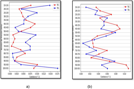 El análisis de la cizalladura vertical del viento arrojó valores de máxima cizalladura vertical en niveles muy bajos de la tropósfera hasta los 850 hPa, tanto en las TES como en las TEC, lo que pudo influir en el flujo de entrada de las celdas convectivas. Otros niveles de gran cizalladura se encontraron entre 450 hPa y 200 hPa en las TEC y entre 550 hPa y 250 hPa para los casos de TES. Esto estuvo relacionado con la presencia de fuertes corrientes en niveles superiores de la tropósfera que posibilitaron cierta estabilidad en las capas bajas de la misma. Los valores mínimos de cizalladura vertical del viento tanto en casos de TEC como de TES se encontraron en niveles entre 850 hPa y 400 hPa.