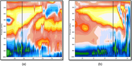 En los casos de TES la capa seca se extendió también desde los 600 hPa, con valores de humedad relativa por debajo de 50%. En solo un caso esta capa seca se extendió a partir de los 500 hPa y en solo dos casos alcanzaron valores de 0% en un área extensa. Los cortes verticales de dos ejemplos, que corresponden a una TEC y una TES, respectivamente, se muestran en la figura 5 y 6.