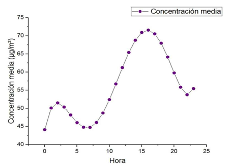 El valor máximo estuvo como promedio cerca de las 4 p.m., momento a partir del cual las concentraciones comenzaron a descender, siguiendo la declinación solar. Sin embargo, los valores máximos están desplazados una hora con respecto al promedio de las observaciones de las fuentes tomadas como referencia (López et al., 2018; Ramírez, 1989). Esto puede deberse a la diferencia de los períodos de tiempo y localidades que se tuvieron en cuenta para cada estudio.