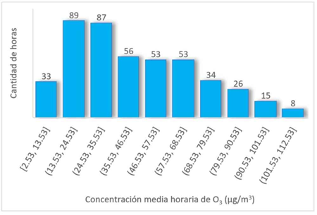 La figura 4 muestra la distribución de frecuencia de las concentraciones de O3 para las horas que se analizaron. Puede apreciarse que predominaron las bajas concentraciones, las cuales representan el 89% del total de horas analizadas.