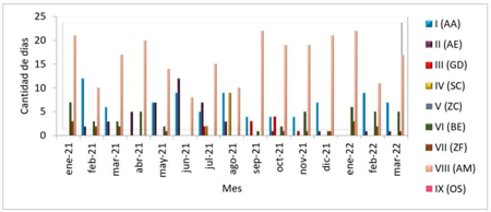 El TSS V corresponde a la influencia de zonas de convergencia. Este TSS suele afectar la mitad occidental del país principalmente en los meses correspondientes al período lluvioso, pero con baja frecuencia. La ausencia de días con el TSS IX pudo deberse a que los pocos casos de difícil comprensión fueron reexaminados y asignados a un subtipo específico (Torres et al., 2020).