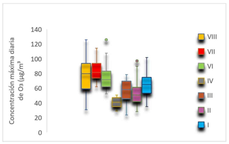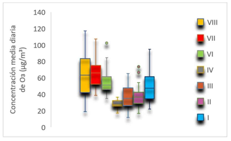También se analizó la distribución de las concentraciones medias diarias (figura 7) de O3 según el TSS. Las concentraciones medias diarias de O3 más elevadas correspondieron al TSS VIII, seguida la VII y I. Las mayores dispersiones también se obtuvieron para el TSS VIII. Este resultado puede deberse a la prevalencia de dicho TSS durante el período estudio. El TSS al cual estuvieron asociados los valores más bajos de concentraciones de O3, así como las menores desviaciones fue el III.