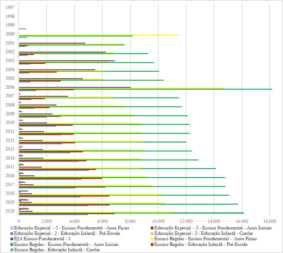 Conforme exemplifica a Figura 1, a expansão da oferta de Educação Infantil de 2001 a 2005, especialmente em creches destinadas a atender crianças de 0 (zero) a 3 (três) anos, cresceu 60,10%; a educação pré-escolar cresceu 461,77%; o Ensino Fundamental 1 foi ampliado em 133,78%, no entanto o Ensino Fundamental 2 teve o número de matrículas reduzido em 1. (PNUD; IPEA; FJP, 2020).