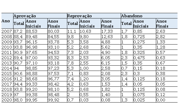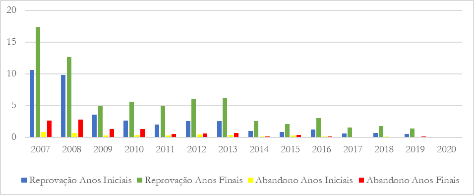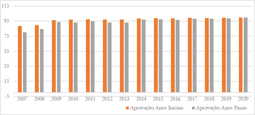 A Figura 2 apresenta a taxa de aprovação dos anos iniciais e finais dos anos de 2007 a 2020. Em 2007, a taxa de aprovação nos anos iniciais foi de 88,53% e a dos anos finais foi de 80,3%, essas taxas aumentaram no decorrer dos anos chegando a 99,95% em 2020 para as séries iniciais e 99,92% para as séries finais. Segundo Fernandes (2007, p. 7), o sistema educacional ideal, seria aquele no qual todas as crianças e adolescentes tivessem acesso à escola, não desperdiçassem tempo com repetências, não abandonassem os estudos precocemente e, ao final de tudo, aprendessem.
