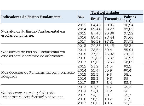 Consagrando a conceituação de Cury (2002, p. 253) “[...] a educação infantil é à base da educação básica, o Ensino Fundamental é o seu tronco e o Ensino Médio é seu acabamento, e é de uma visão do todo como base que se pode ter uma visão consequente das partes.” Desta forma, a Tabela 1 evidencia alguns dos indicadores educacionais entre o Brasil, Tocantins e Palmas. As taxas de analfabetismo em 1991, em Palmas é 14,76 abaixo do estado de 25,95 e do Brasil com 16,80. Estas taxas de analfabetismo em Palmas representam o grande fluxo migratório de pessoas despreparadas em busca de melhoria de vida, já o indicador “% de 5 a 6 anos na escola” em Palmas é 35,23 maior do que no estado com 28,32 e o % de 6 a 14 anos na escola com 70,43 e no estado com 67,5. A taxa no Ensino Fundamental nos anos finais é três vezes mais alta em comparação à taxa dos anos iniciais. Uma distorção idade/série elevada aumenta o risco do abandono escolar dos alunos.