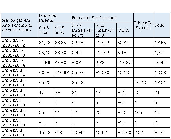 Mesmo que o Plano Nacional de Educação (PNE) trouxesse como meta impetrar a universalização da Educação Infantil para crianças de 4 (quatro) e 5 (cinco) anos de idade até 2016, a obrigatoriedade da educação nessa faixa etária já está cuidada há mais tempo na legislação brasileira. Data de 11 de novembro de 2009, a Emenda Constitucional n.º 59, que anteviu a obrigatoriedade da Educação Infantil a partir dos 4 anos, estabelecendo como prazo para sua implantação o ano de 2016. Na sequência, a Lei n.º 12.796, de 04 de novembro de 2013, incluiu a obrigatoriedade na Lei de Diretrizes e Bases da Educação Nacional (LDB) (BRASIL, 2013), e dispôs, ainda, ser dever dos pais ou responsáveis efetuar a matrícula das crianças na educação básica a partir daquela idade. Deste modo a Tabela 3 evidencia a distribuição das matrículas na rede de ensino nos anos de 2001 a 2021, o que evidencia o cumprimento da legislação. Os dados demonstram que nesse período as matrículas da rede pública municipal expandiram-se em 18,89%, com crescimento de 338,26% na Educação Infantil e 92,22% no Ensino Fundamental.