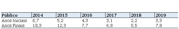 A Figura 3 apresenta a taxa de reprovação e abandono no Ensino Fundamental. É importante considerar as taxas de abandono e distorção idade/série, que se somadas às taxas de reprovações e a baixa aprendizagem, impactam fortemente nas matrículas finais, o que demonstram, por fim, a dificuldade de permanência do aluno com sucesso na escola. A taxa de aprovação na Educação Fundamental, em 2012, era de 97,8% nos anos iniciais, 90,7% nos anos finais e a taxa de abandono era de 0,2% e 1,2% respectivamente, conforme Figuras 2 e 3.