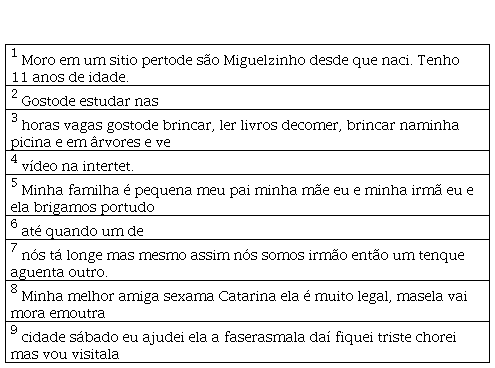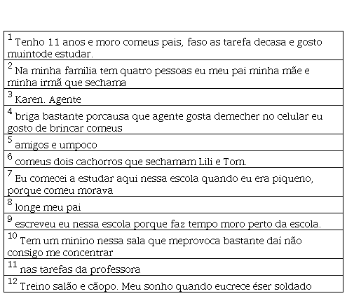 Tais ocorrências também se fizeram presentes nas demais produções textuais pertencentes ao nosso corpus geral, nas quais foi possível observarmos ainda o uso indevido de letras maiúsculas e minúsculas, ausência de sinais pontuação e a falta e/ou o emprego indevido dos acentos gráficos; além de diversos problemas de ordem semântica e sintática.